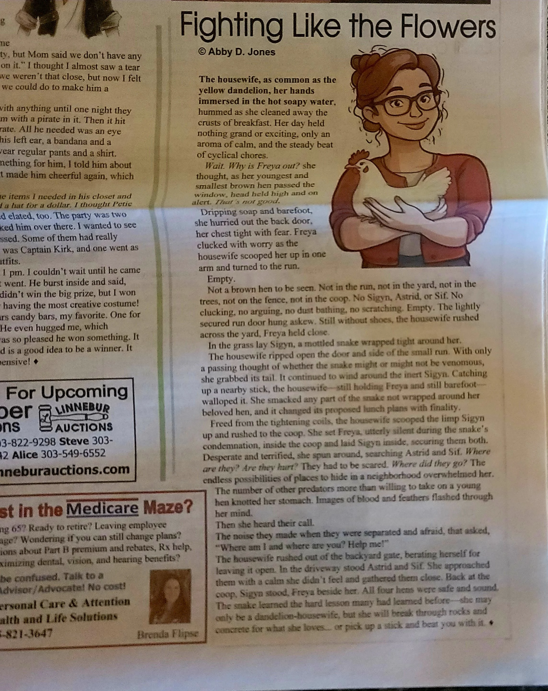 Freed from the tightening coils, the housewife scooped the limp Sigyn up and rushed to the coop. She set Freya, utterly silent during the snake’s condemnation, inside the coop and laid Sigyn inside securing them both. Desperate and terrified, she spun around searching for Astrid and Sif. Where are they? Are they hurt? They had to be scared. Where did they go? The endless possibilities of places to hide in a neighborhood overwhelmed the housewife. The number of other predators more than willing to take on a young hen knotted her stomach. Images of blood and feathers flashed through her mind.